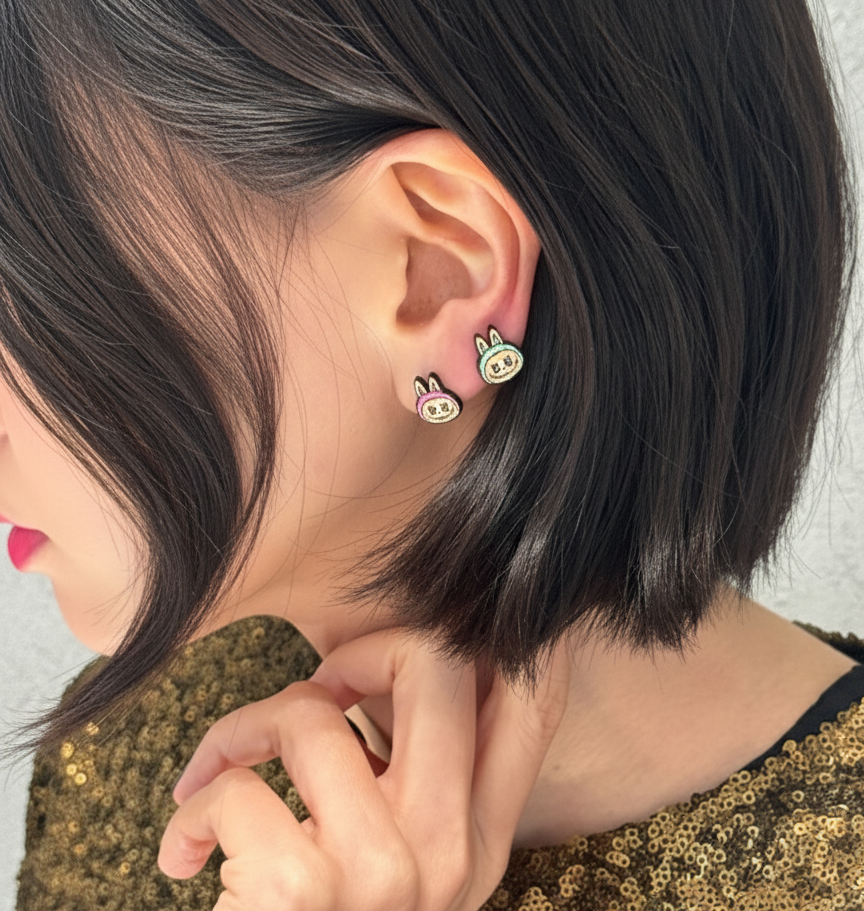 Handmade Moncici-Inspired Earrings,Kitsch Retro Character Silver Post , Cute Vintage Toy Jewelry, Korean Handmade,k-pop accessories,