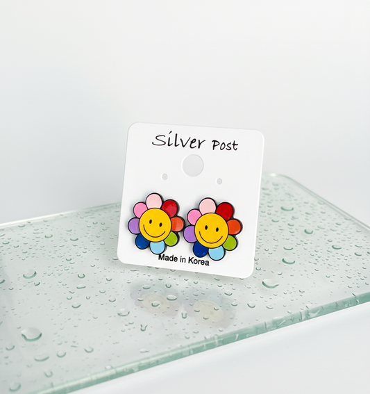 Smiley Flower Stud Earrings in White & Multicolor – Handmade in Korea