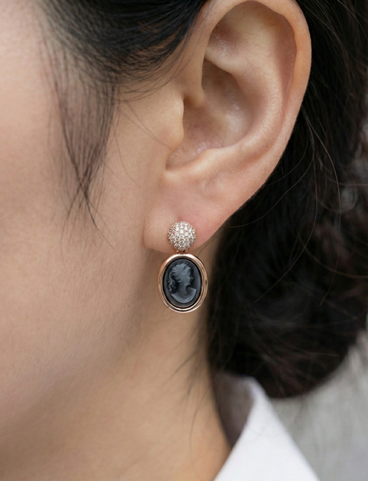 Vintage Cameo Drop Earrings with Pave Crystal Studs - Rose Gold