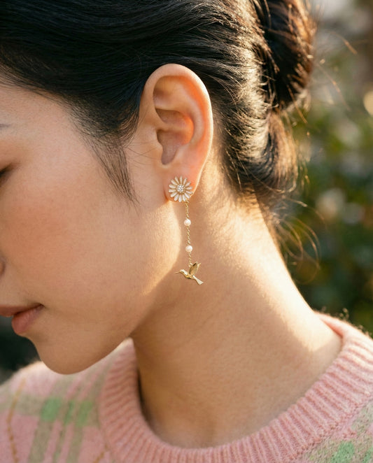 Handmade Daisy Flower Hummingbird Front-Back Drop Earrings - Titanium Post
