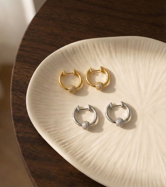 Pave Ball Huggie Hoop Earrings - Titanium Post Gold Silver Plated
