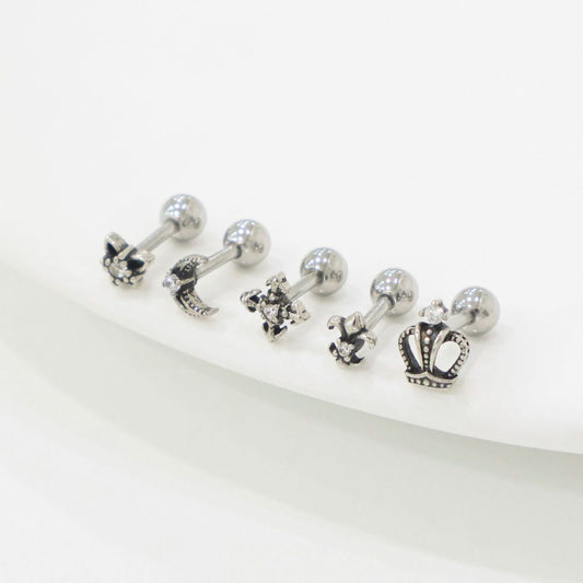 Gothic Stud Earrings,Star, Moon, Cross, Fleur de Lis, Crown Surgical Steel barbell stud
