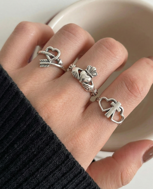 925 Sterling Silver Vintage Ring - Claddagh, Cupid Arrow & Heart Cross
