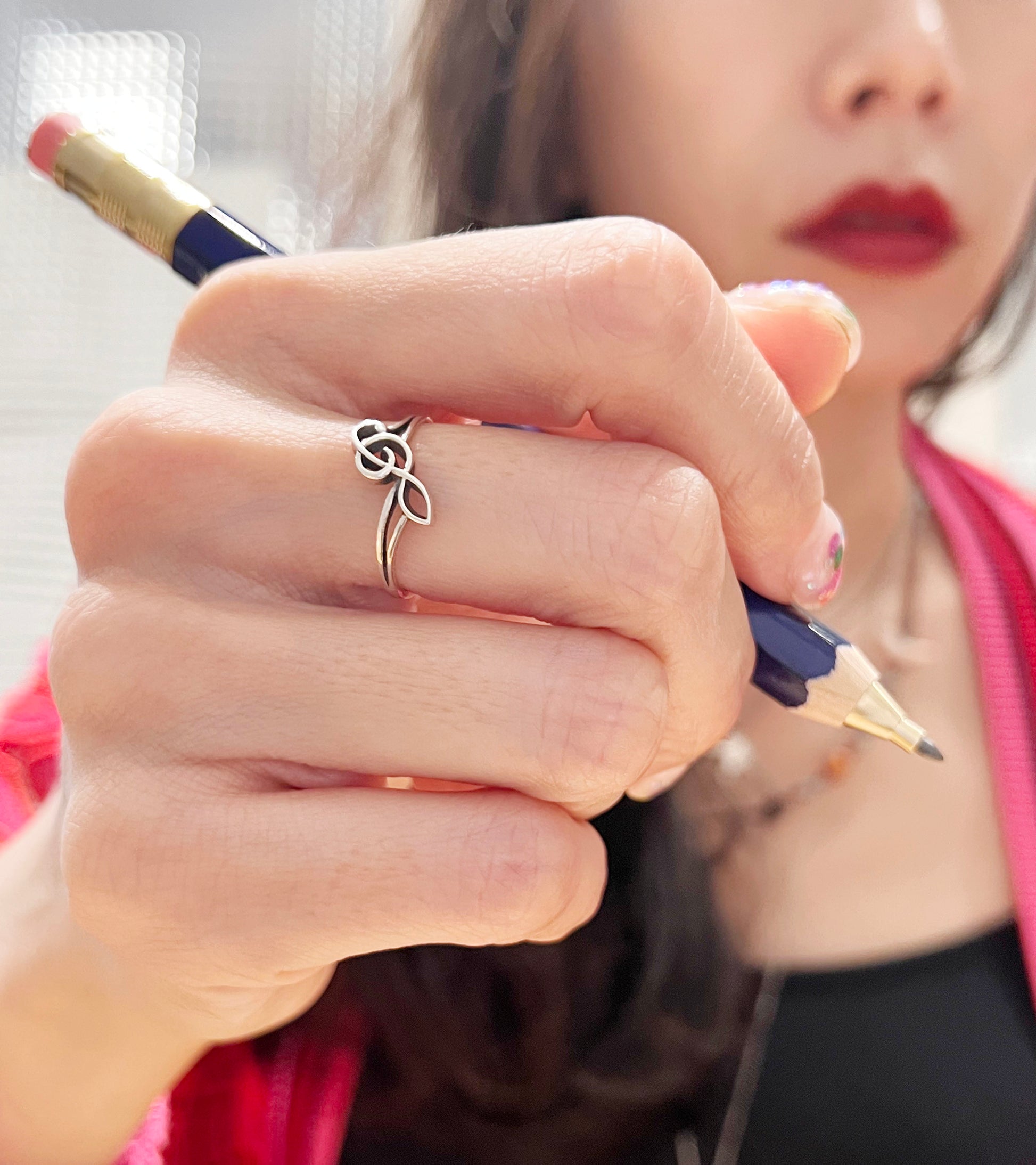 A minimal sideways treble clef design crafted carefully one by one in solid 925 silver. The flowing line form sits softly across the finger, making it an elegant daily piece for music lovers.