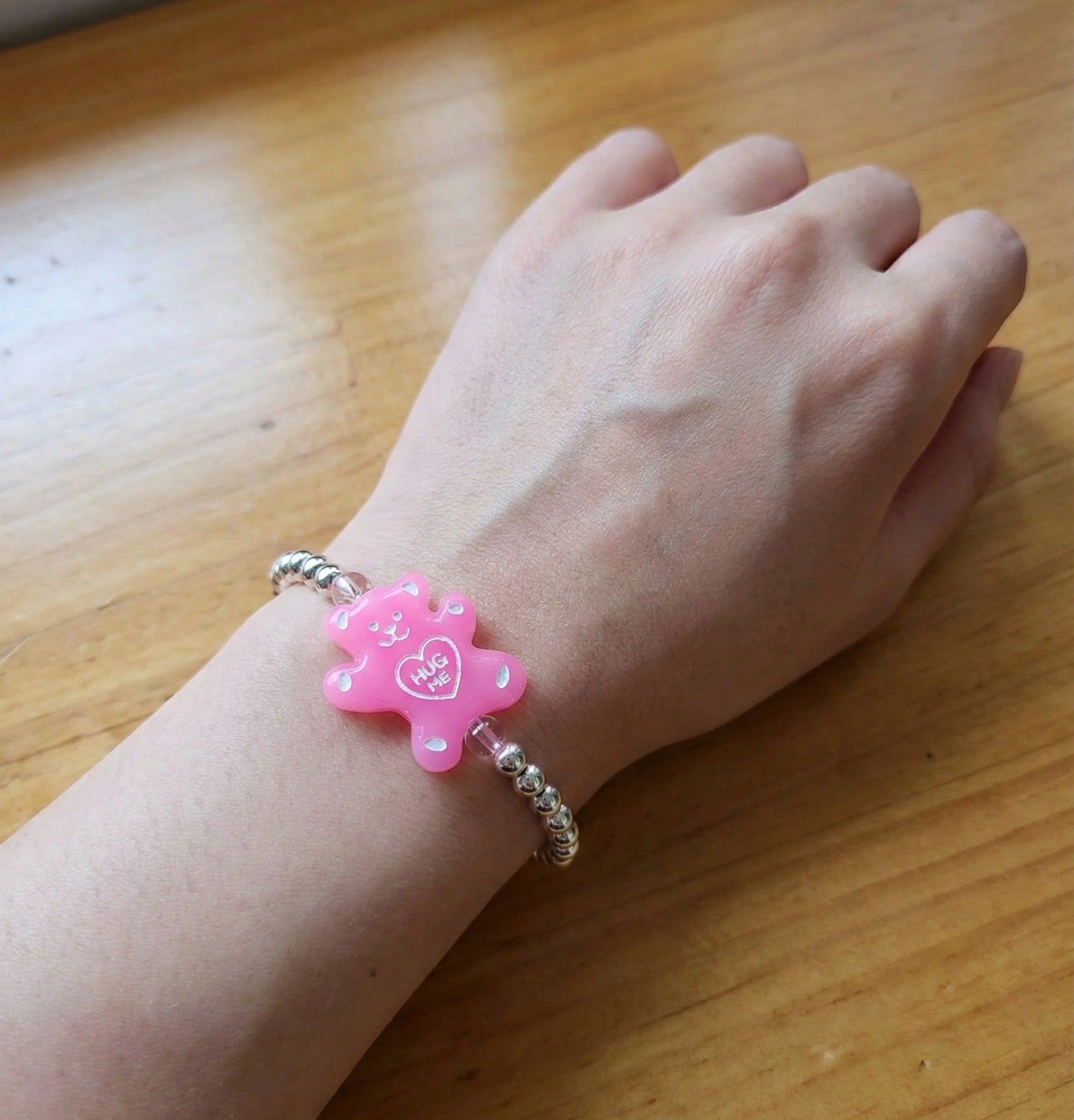 - "Hug Me" lettered charm — acrylic jelly bear with heart detail