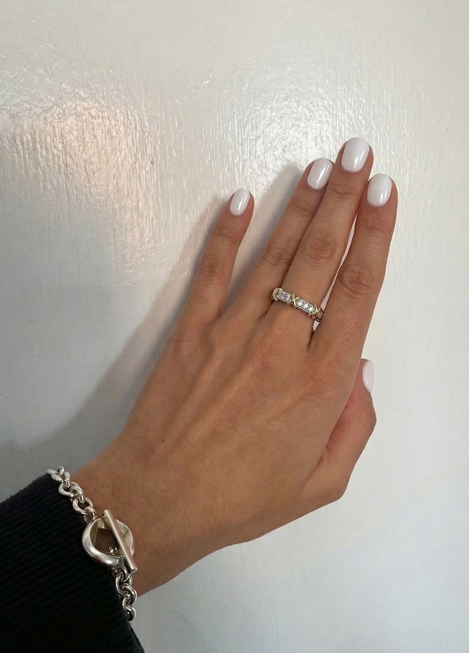 | Style | Eternity band, X-cross accent, two-tone, statement ring |