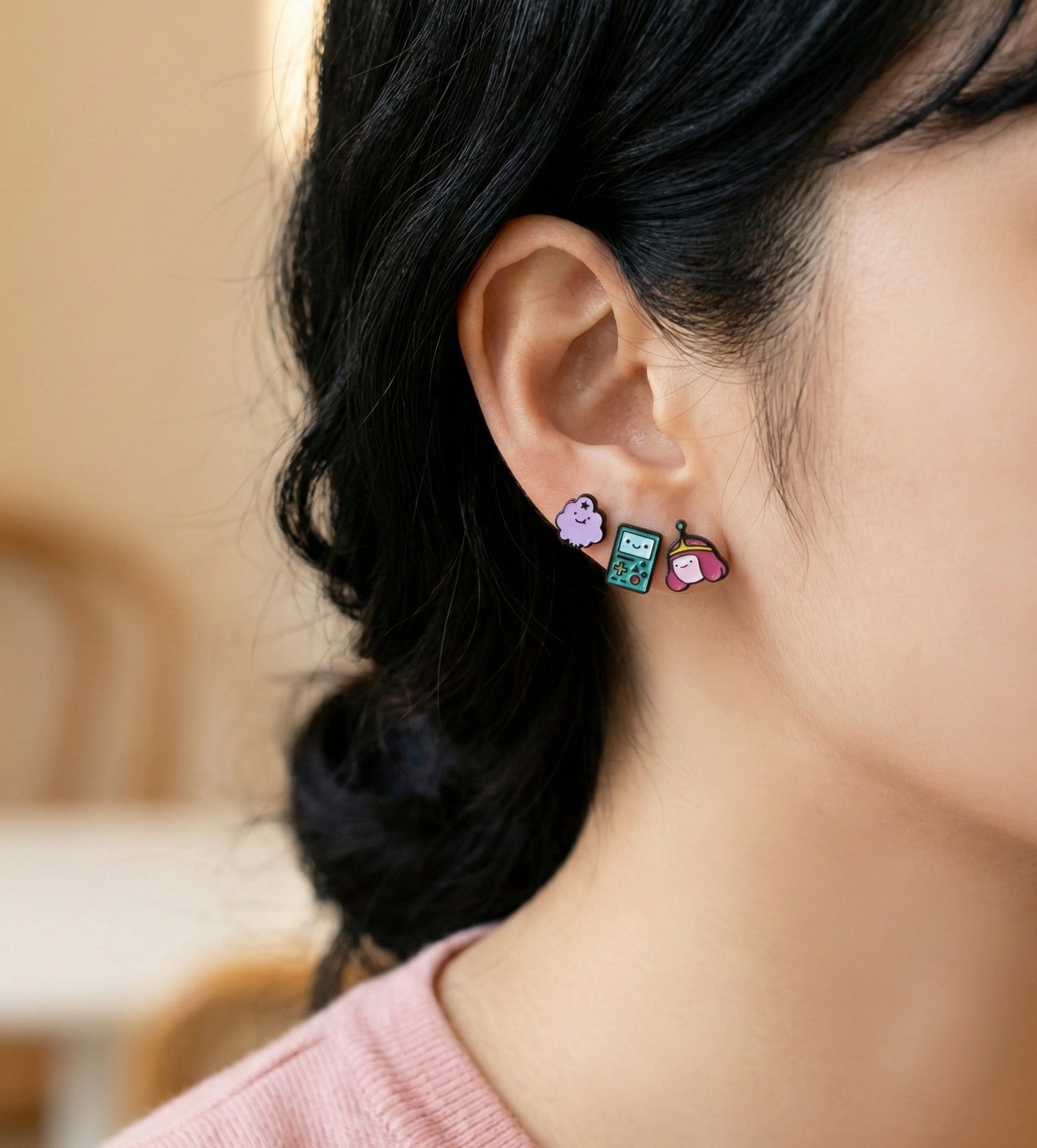 Bring the magic of the Land of Ooo to your everyday style with these high-quality Adventure Time character stud earrings. Featuring beloved characters like Finn the Human, Jake the Dog, BMO, Princess Bubblegum, and LSP, each earring is meticulously crafted with vibrant enamel detailing that captures every smile, button, and quirky expression.