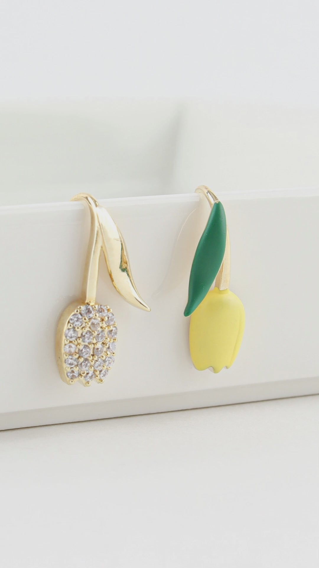 - Asymmetric design: pavé bloom + matte enamel bud for a playful mismatch.