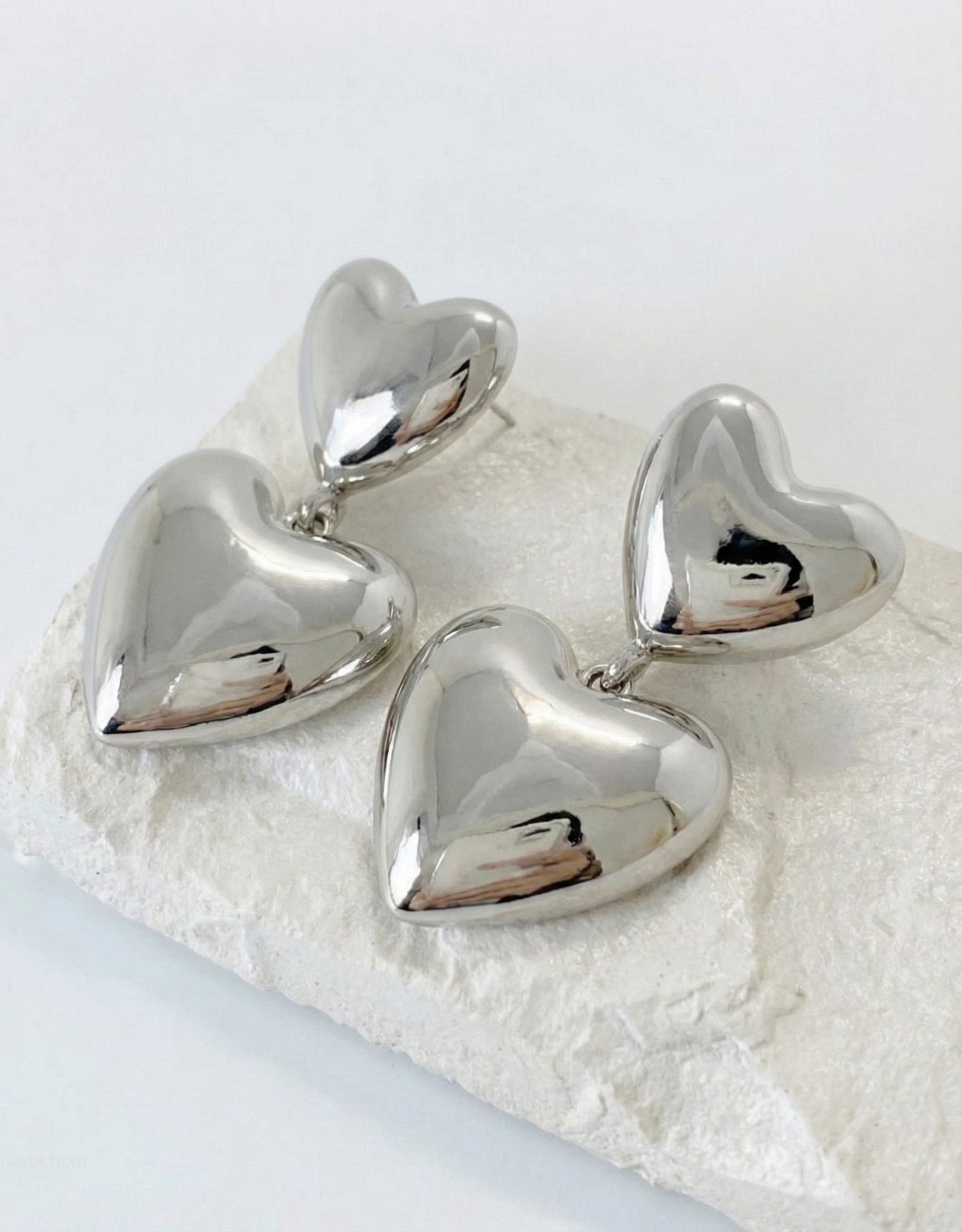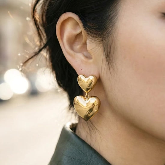Chunky Puffed Double Heart Drop Earrings - Gold & Silver