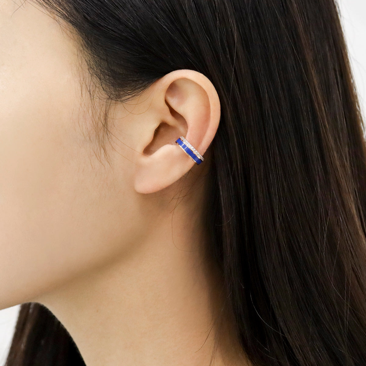 Stackable shine, no piercing needed. A sleek helix ear cuff lined with pavé cubic zirconia and a glossy enamel stripe. It hugs the cartilage securely and adds instant sparkle to any look.