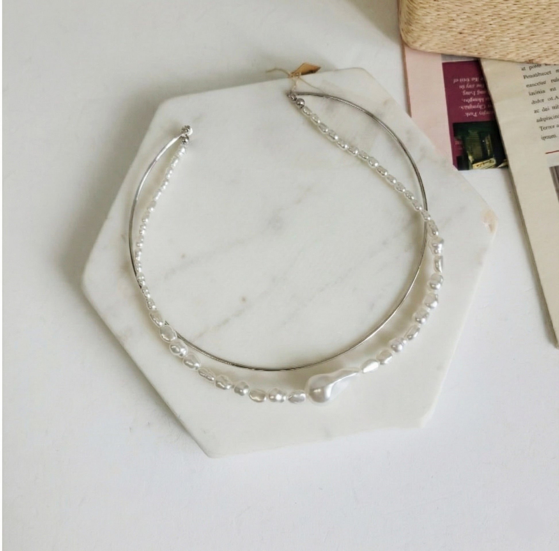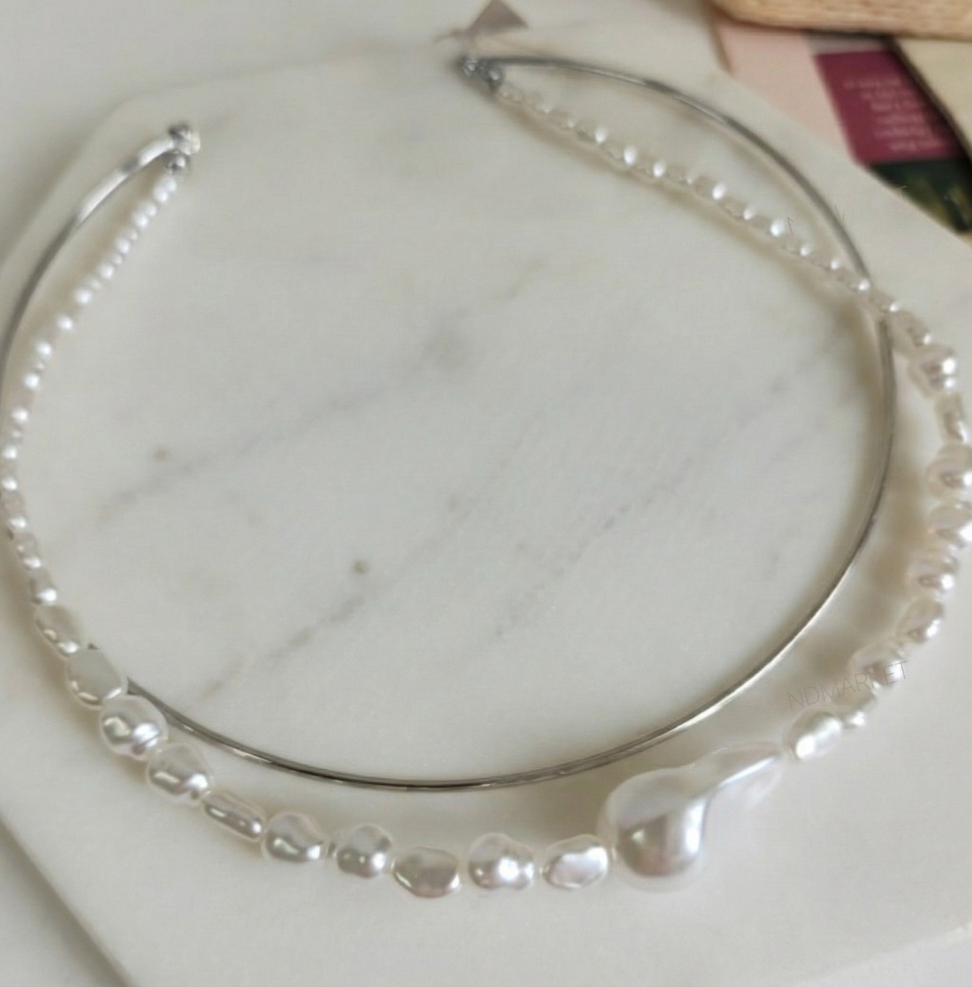- 2-in-1 Layered Design: Rigid brass wire choker paired with a delicate pearl strand for instant dimension