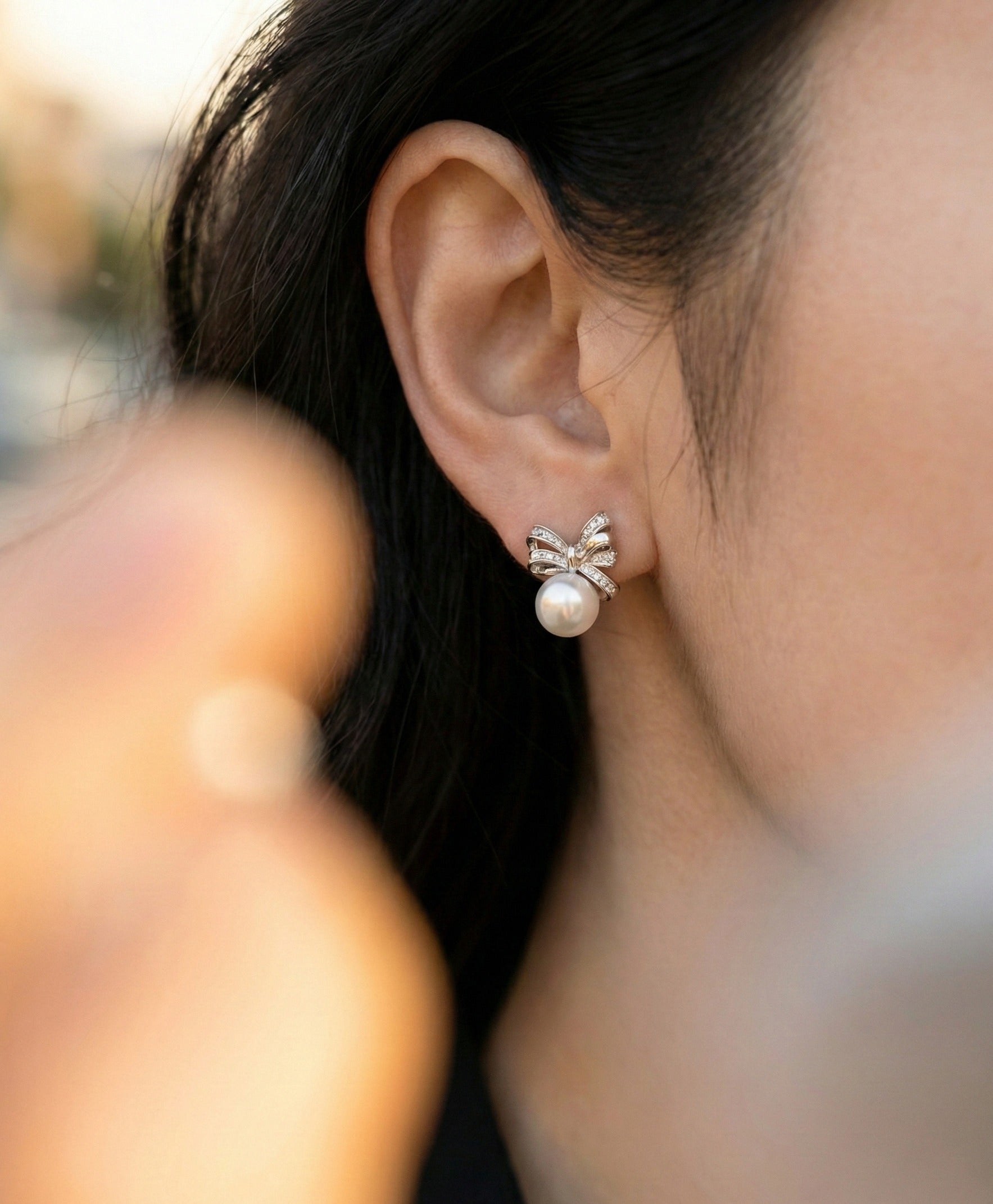 Meet the earrings that turn heads wherever you go. Our Ribbon Bow Pearl Stud Earrings combine delicate craftsmanship with timeless elegance—featuring a sparkling cubic zirconia ribbon bow gracefully cradling a lustrous shell pearl.