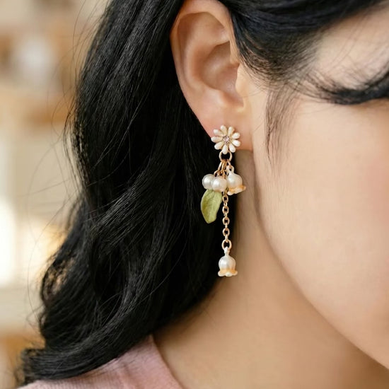 Embrace the romantic cottagecore aesthetic with our delicate Lily of the Valley Drop Earrings. Carefully handmade in South Korea, these exquisite dangle earrings feature a lovely daisy stud, charming flower bells, elegant faux pearls, and a textured green leaf cascading down a dainty brass chain.