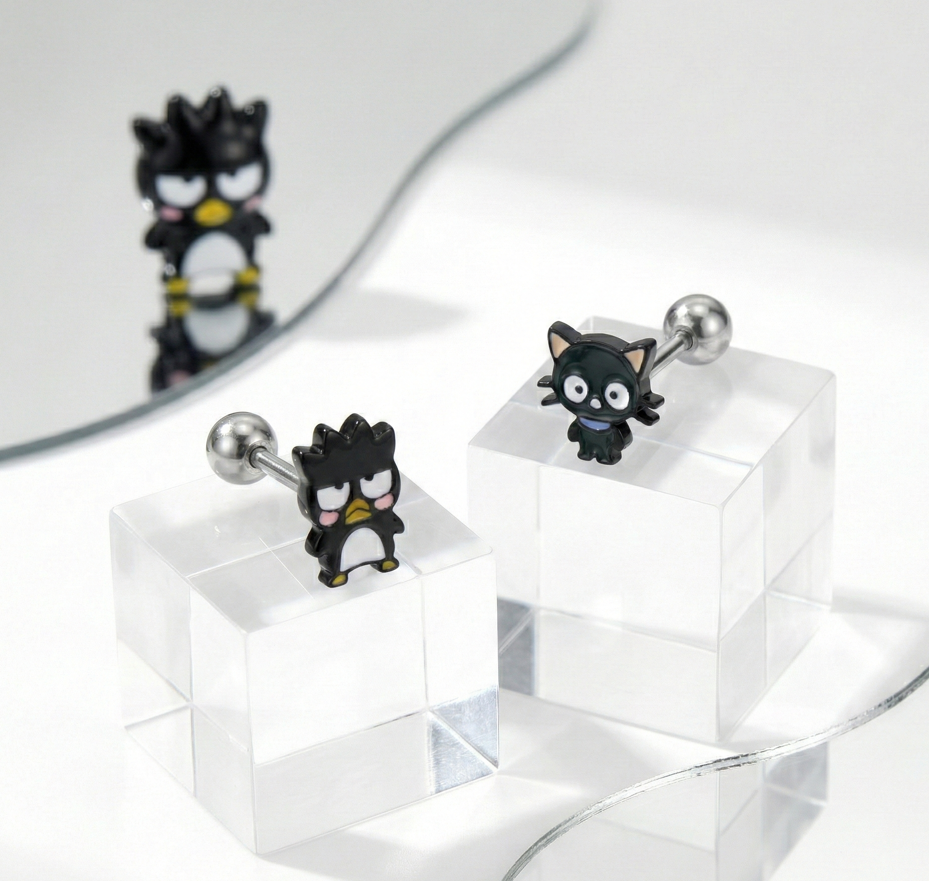 Meet the cheekiest penguin and his adorable feline friend from Sanrio. These high-quality character piercing studs are Handmade in Korea, ensuring superior detail and craftsmanship compared to mass-produced alternatives.