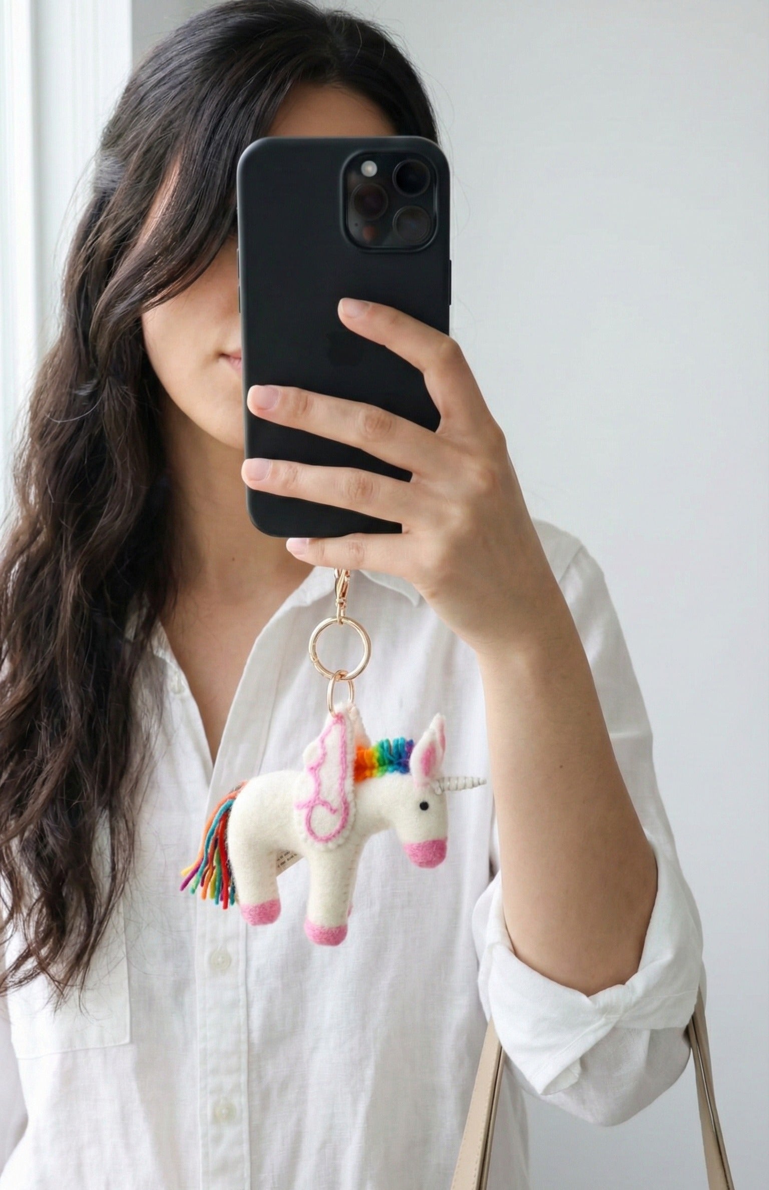 - Material: Needle-felted wool, rainbow yarn, gold-tone metal keyring