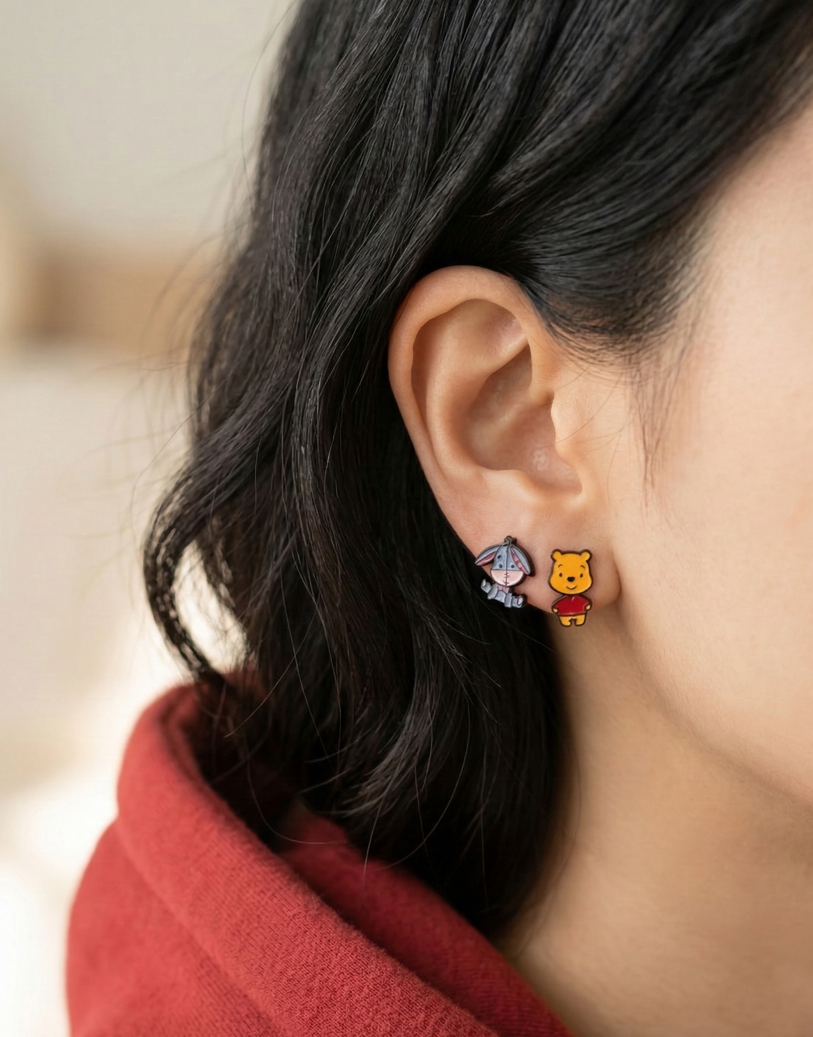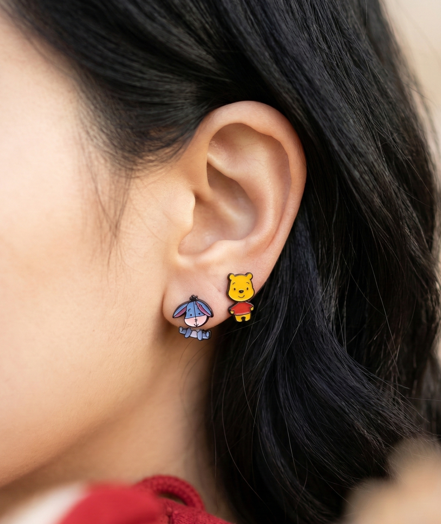 - Innovative Two-Way Design: The character's head acts as the front stud, while the body attaches to the back post, creating a fun 3D illusion of Pooh and Eeyore hanging from your earlobe. Wear just the head for a simple look, or attach the body for the full jacket style!