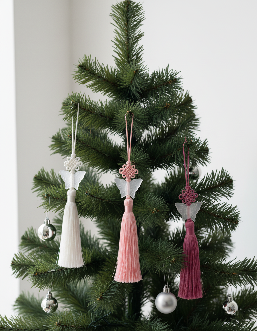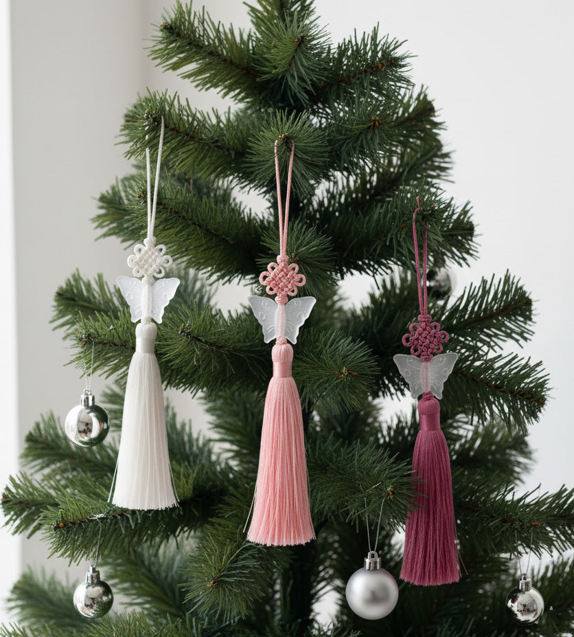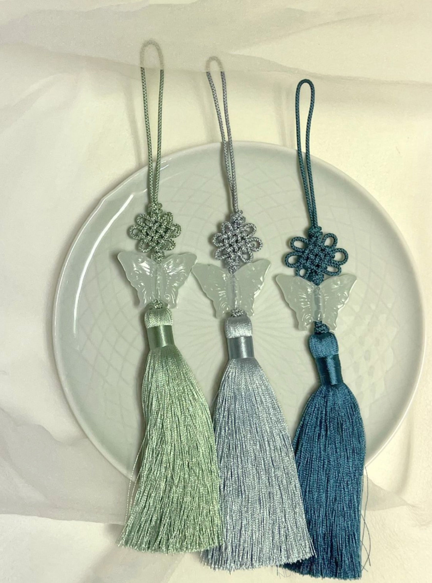 Each piece is carefully crafted with a translucent butterfly pendant, delicate traditional knots, and silky tassels.
