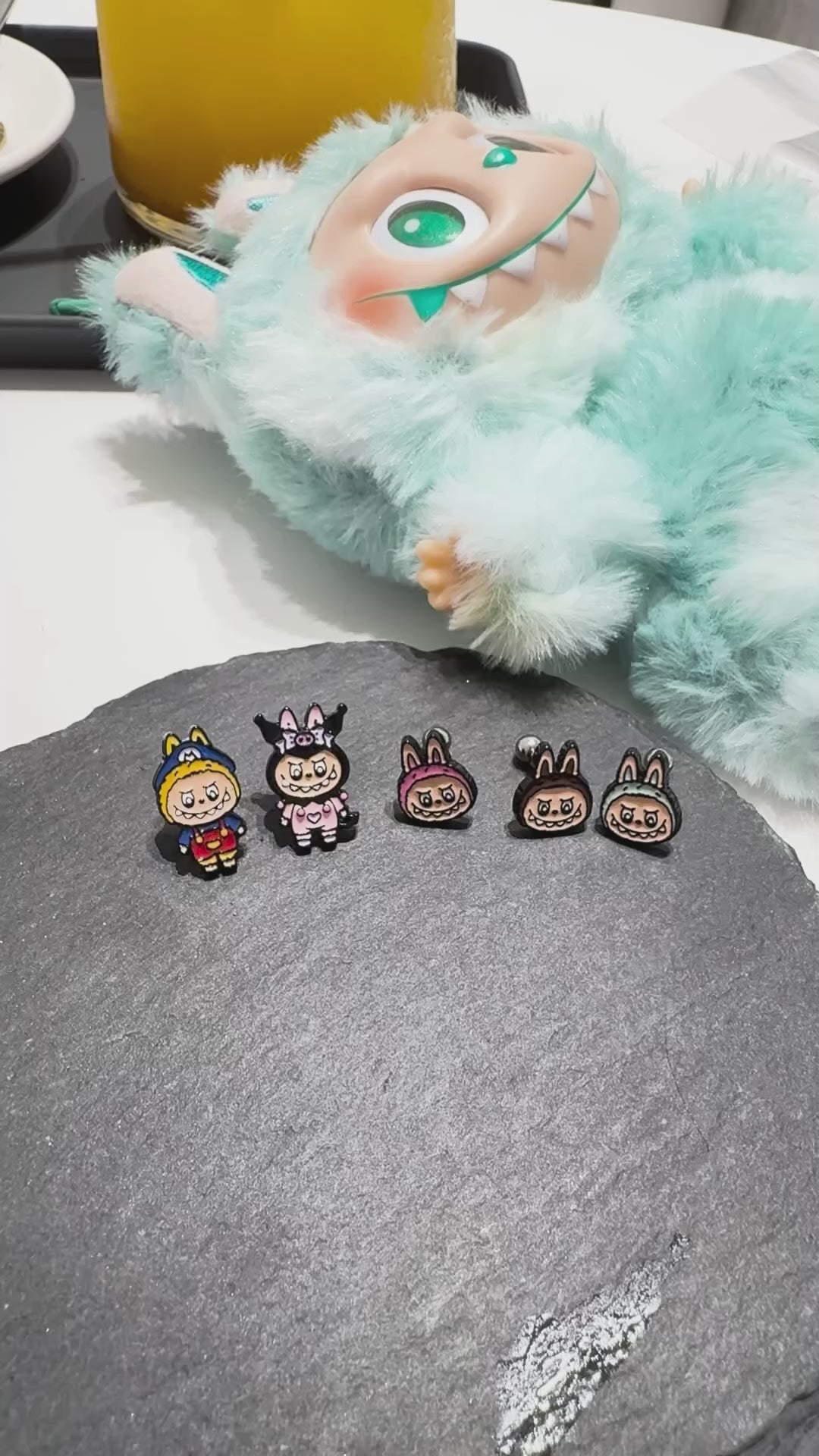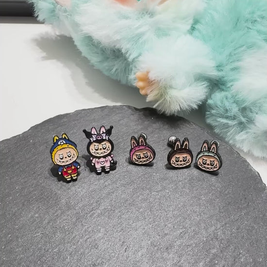 Labubu-inspired handmade barbell earrings, crafted in Korea with surgical-steel hardware and hand-coated character charms for a glossy, cute finish.