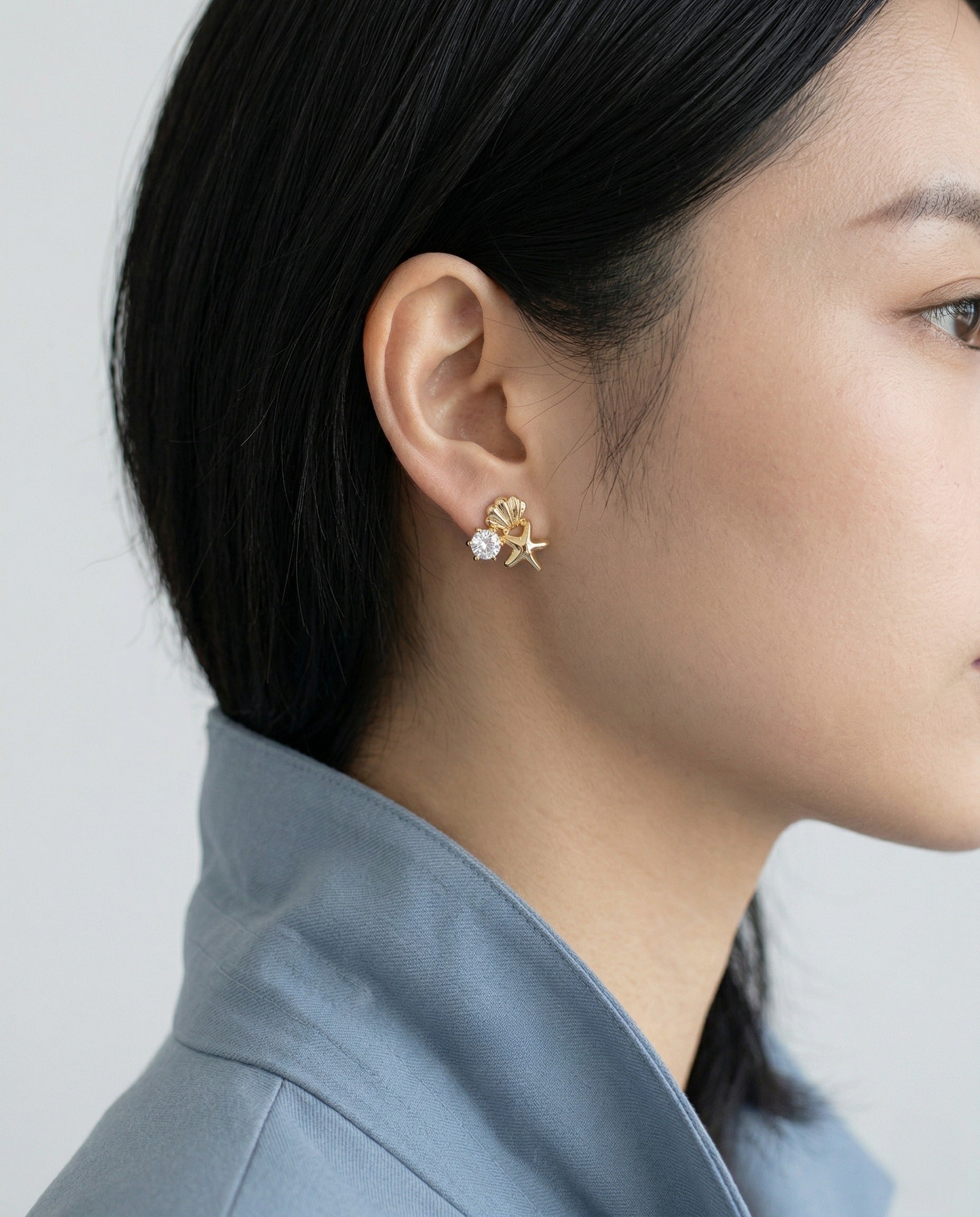 Mermaidcore Shell & Starfish Cubic Zirconia Stud Earrings | Hypoallergenic Titanium Post | Gold & Silver