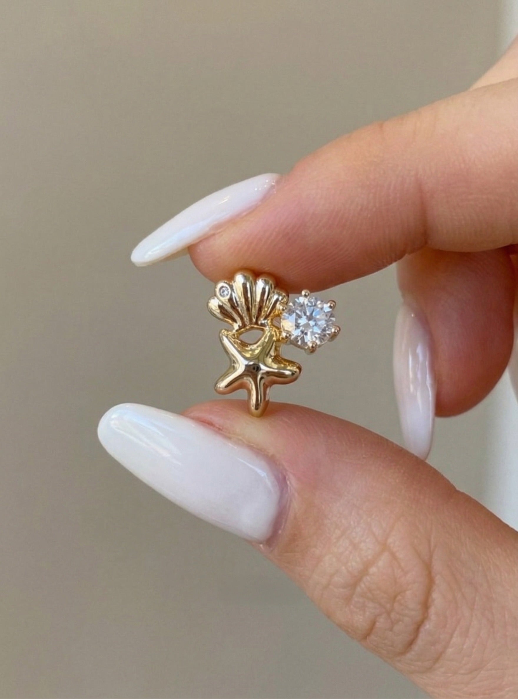 Some earrings whisper. These ones shimmer. Inspired by the treasures hidden beneath the waves, our Mermaidcore Shell & Starfish Stud Earrings bring together two of the ocean's most beloved motifs — a delicately ridged scallop shell and a sculptural, plump starfish — crowned by a brilliant round-cut cubic zirconia that catches every ray of summer light. This is your earscape, complete.