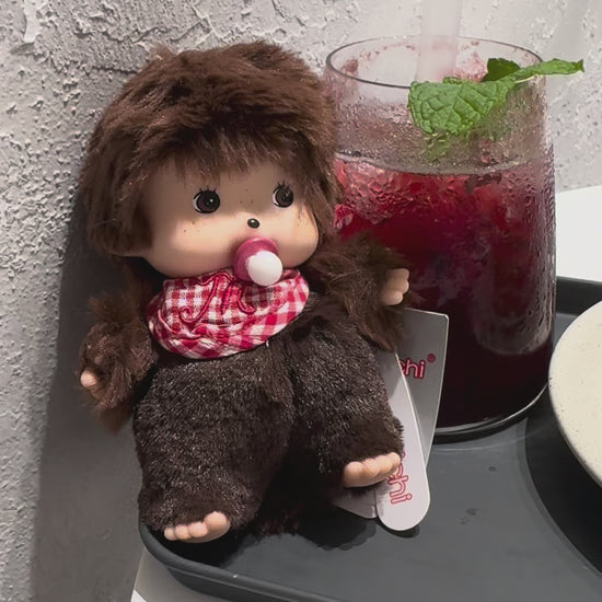 A nostalgic charm that brings back warm childhood memories — this Monchhichi doll keychain features a classic red gingham bib with a soft plush body and signature pacifier detail. Its compact size makes it perfect for attaching to your bag, keys, or even as a cute desk companion.