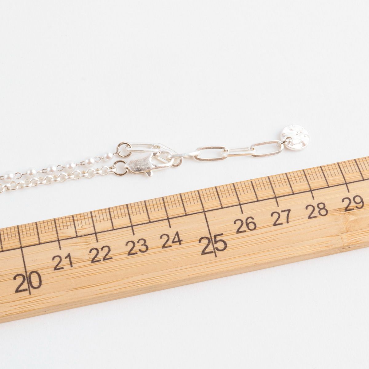 Elegant pearl chain with a soft ribbon pendant — a feminine necklace designed to brighten any daily look. The faux pearl chain connects naturally with a smooth brass ribbon pendant, adding a gentle, polished glow to your outfit.