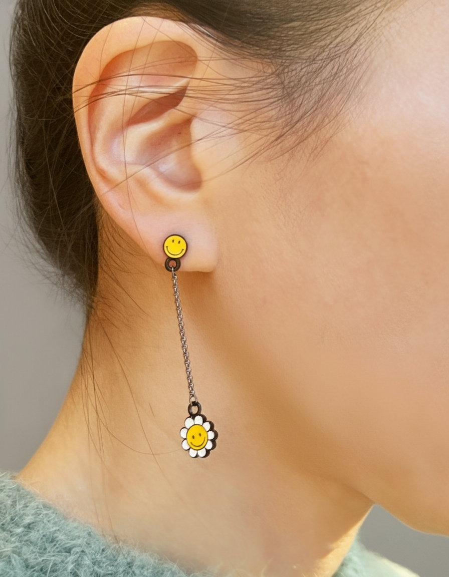 A playful pair of handmade drop earrings featuring a bright smiley flower charm. Total length 6cm with a 1cm daisy pendant — lightweight, cute, and easy for daily styling.